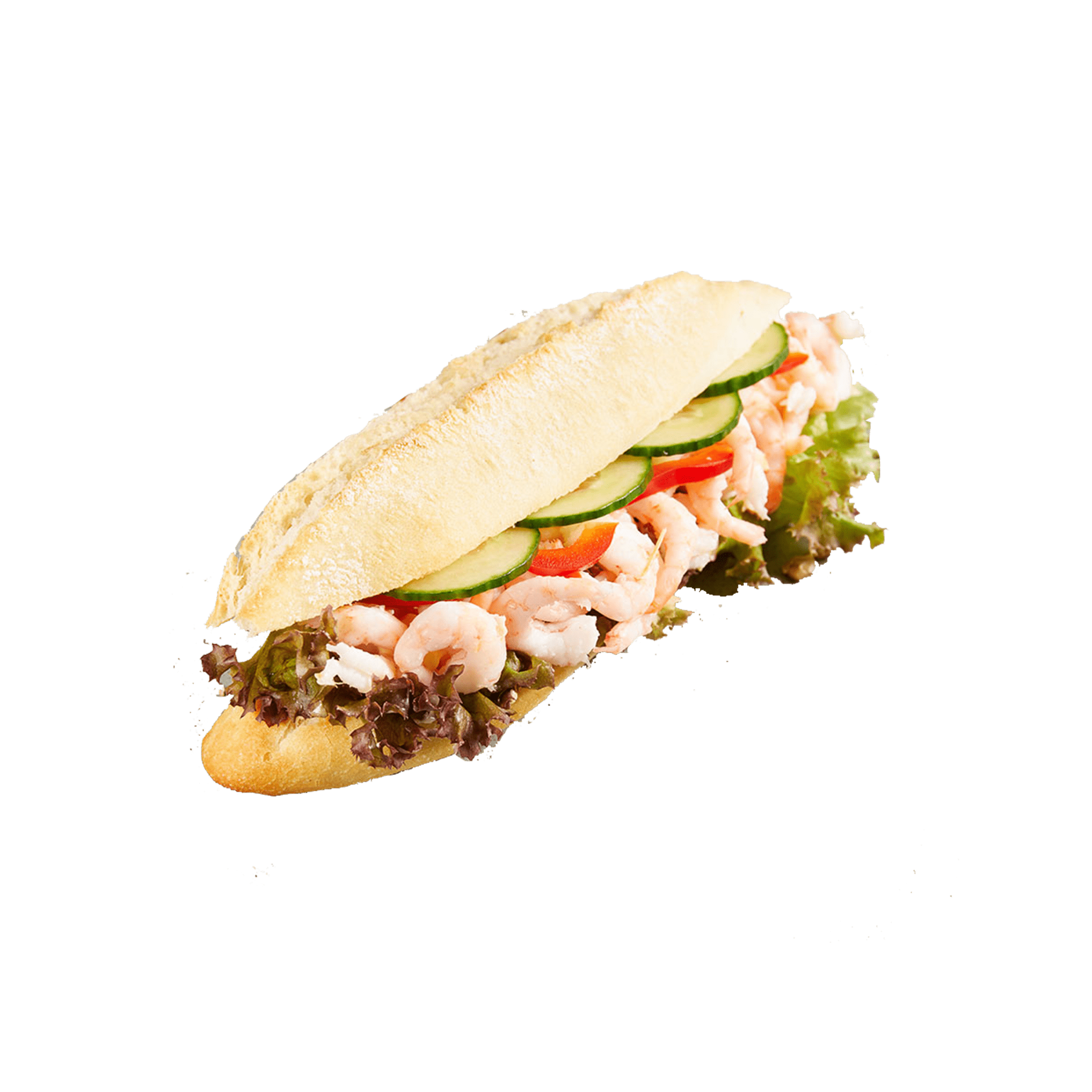 Ingredienser: Baguette, Reker, Majones, Smør, Salat