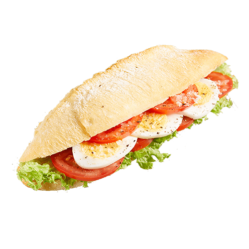 Ingredienser: Baguette, Egg, Smør, Majones, Salat